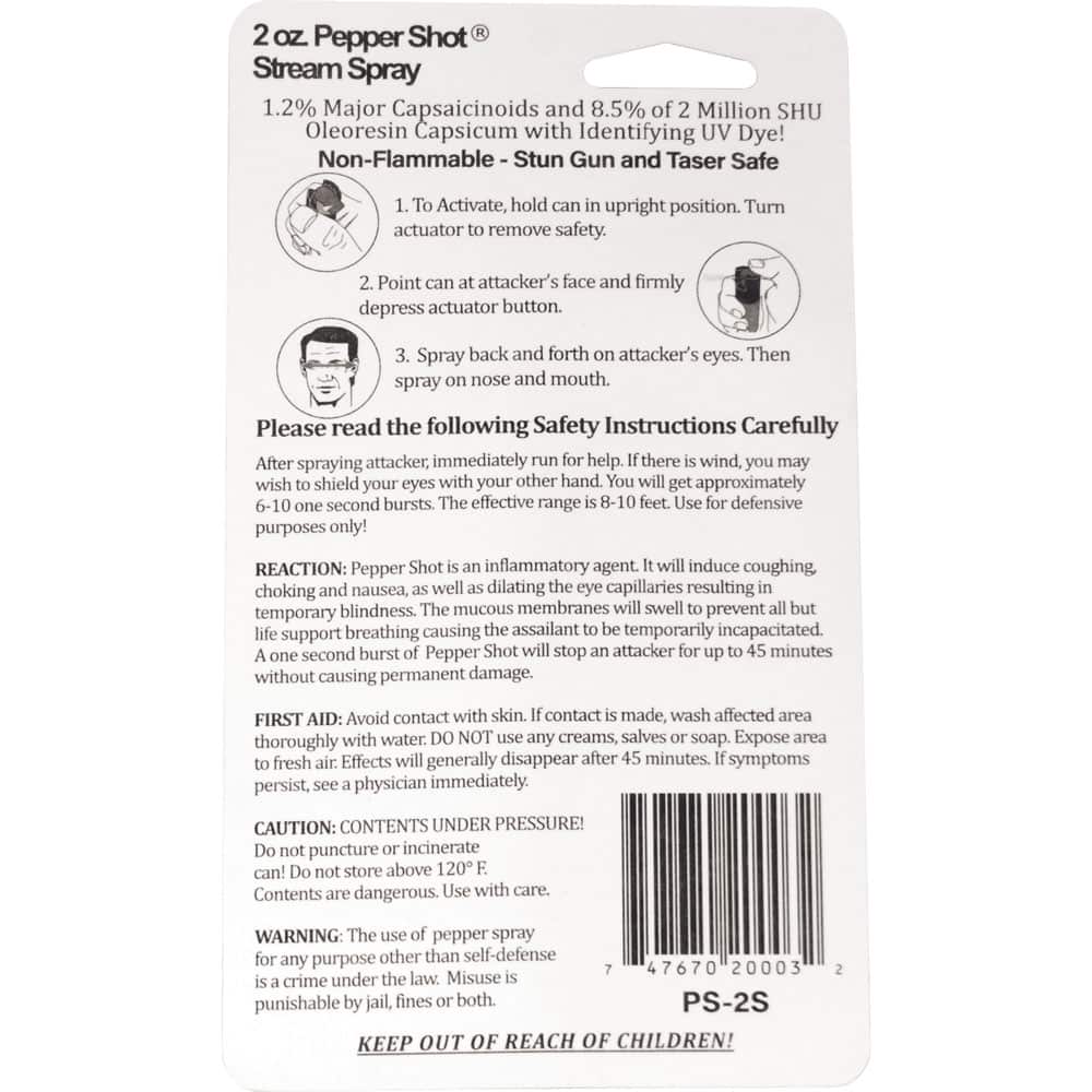 Pepper Shot has an 8.5% oleoresin capsicum formula made from 2,000,000 SHU’s of raw pepper. In addition to causing an attacker pain, this formula swells the mucous membranes. Making breathing difficult. And swells the veins in the eyes. Causing the eyes to close. These effects can last up to 45 minutes. But without causing permanent damage. . This 2 ounce pepper spray provides 6-10 one second bursts. At a safe range of 8-10 feet. And measures 4 ⅛” x 1 ⅜”.